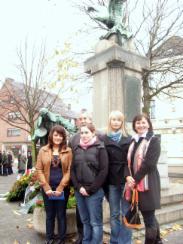 Die Schülerinnen Hannah Thelen, Rachel Lentzen und Esra Demircan haben gemeinsam mit Dr. Axel J. Prümm auf dem Volkstrauertag am Grevenbroicher Denkmal auf dem Platz der Deutschen Einheit vorgetragen.