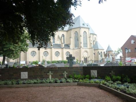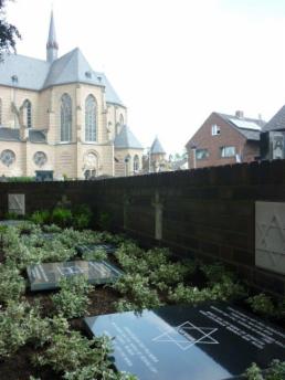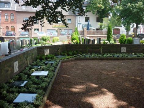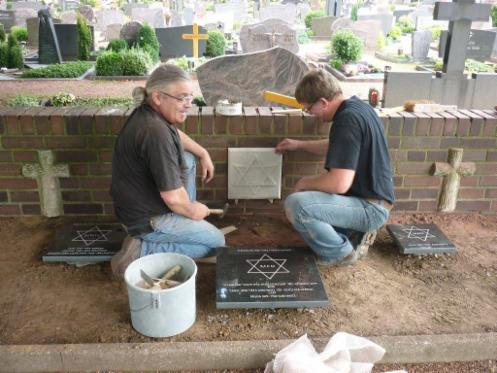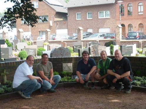 Die Gedenkstättenerweiterung nimmt Form an. Initiator Bernd Franzen (rechts, vorne), Wilhelm Peltzer VdK, (rechts, hinten) und die Schützenkameraden der ersten Regimentsfahne, Nico Weenen, Justin Babin und Justus Baltes (von links) verlegen derzeit an der Gedenkstätte auf dem Pfarrfriedhof die neuen Tafeln mit den Namen und Daten der jüdischen Mitbürgerinnen und Mitbürger, die in Gustorf und Gindorf gelebt haben.