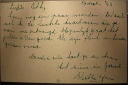 Noch aus dem Zug konnte Hertha Aussen ihrer Freundin Netty einen letzten Brief schreiben: „Mein liebes Nettchen, die letzte Abschiedskarte bekommst Du aus dem Zug. Wie du sehen kannst. Wir sitzen hier mit vierzig Menschen und Gepäck und es ist sehr stickig in dem Viehwaggon. Wir sind voll guter Hoffnung auf ein baldiges Wiedersehen in unserem geliebten, kleinen Holland. Leb wohl, ein Kuss. Hertha“.