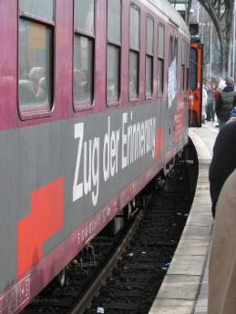 stehende Dampflok aus dem Jahr 1919. Viele Menschen auf dem Kölner Hauptbahnhof bewundern zunächst die Lok auf Gleis 1, das auch als direkte Verbindung zwischen Domplatte und Hauptbahnhof von vielen Menschen genutzt wird. Vor dem Zug mit drei Anhängern haben sich lange Warteschlangen gebildet. Der Zug trägt die Aufschrift „Zug der Erinnerung“. Vielen Besuchern des Gleises 1 wird erst jetzt klar, dass sich in den Waggons die Ausstellung befindet, die das Schicksal deportierter Kinder nach Auschwitz thematisiert und durch ganz Deutschland Halt in Bahnhöfen macht, bevor der Zug am 8. Mai 2008 sein endgültiges Ziel Auschwitz ansteuern wird. Und er bereitet viel Ärger. Denn die Deutsche Bahn AG stellt für diesen Zug, der deutschlandweit von vielen Bürgerinitiativen finanziert wird, pro gefahrenen Kilometer, pro Aufenthaltsstunde in den Bahnhöfen ebenso wie für die Bereitstellung von elektrischem Licht „aus Gleichbehandlungsgründen“ – denn sonst könnten ja viele Bürgerinitiativen kommen- eine Rechnung und ignoriert selbst einen Appell des Verkehrsausschusses des Bundestages, eine Summe in Höhe des Rechnungsbetrages wenigstens zu spenden. Ein Skandal, der bei den Initiatoren, den nunmehr über 140.000 Besuchern des Zuges, vor allem aber bei jüdischen Überlebenden und den jüdischen Gemeinschaften in Deutschland zu heftigen emotionalen Reaktionen, wie am vorvergangenen Wochenende in Düsseldorf sogar zu Entgleisungen gegen den Bahnchef Hartmut Mehdorn führte. Denn die Deutsche Reichsbahn war in der NS-Zeit ein entscheidender Bestandteil der Vernichtungsmaschinerie und verdiente darüber hinaus auch noch an den Deportationen. 4 Pfennige pro Streckenkilometer für Erwachsene, 2 Pfennige pro Kind, gewährte allerdings einen Mengenrabatt für Züge ab 400 Personen.
